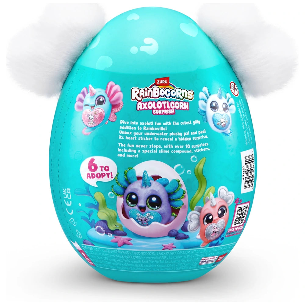 Contents: 1x Rainbocorns Axolotlcorn Plush, 2x Eggs, 1x Boo-boocorn, 1x Pack Rainbocorns Slime, 1x Collector's Guide and 7x Stickers