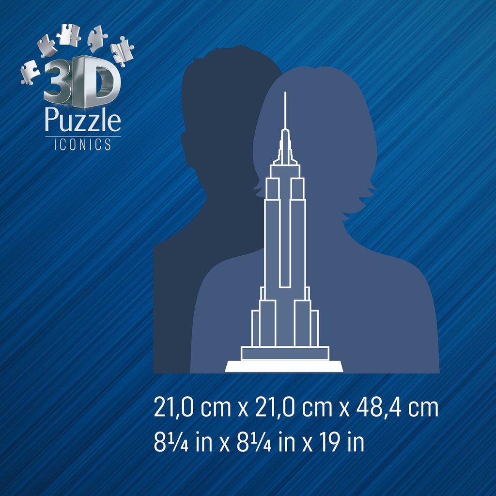 The 102-storey Empire State Building is an integral part of the New York skyline at night. Assembling this iconic skyscraper yourself in 3D puzzle format is both an exciting and relaxing activity for great builders and those who want to become one. Once completed, the Art Deco highlight can even shine in warm white or colored light thanks to the included LED light. Our Night Edition Empire State Building jigsaws are crafted with premium quality and when completed are 48cm high. Great 3D puzzles for Children 10 years old and up. Fully complies with all necessary UK and EU testing standards