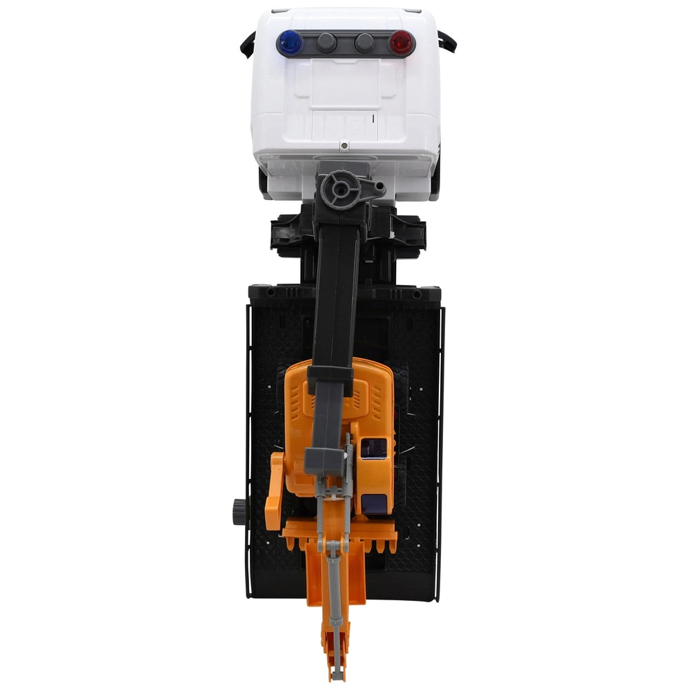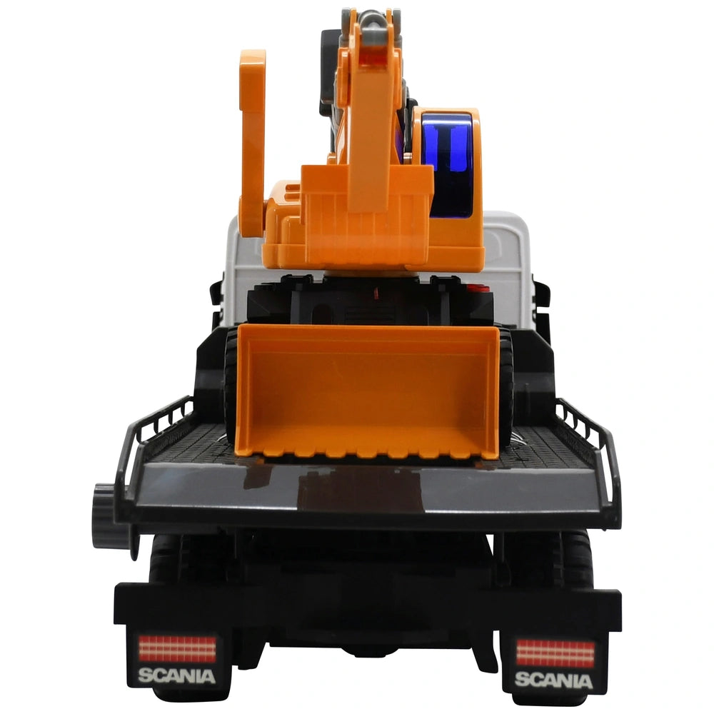 The main truck features working sound and light effects, as well as a front-opening cab, adding extra layers of play. The flatbed trailer is equipped with a 360° rotating crane arm and an adjustable tilting platform controlled by a dedicated button, making it easy to load and unload the excavator just like on a real construction site.