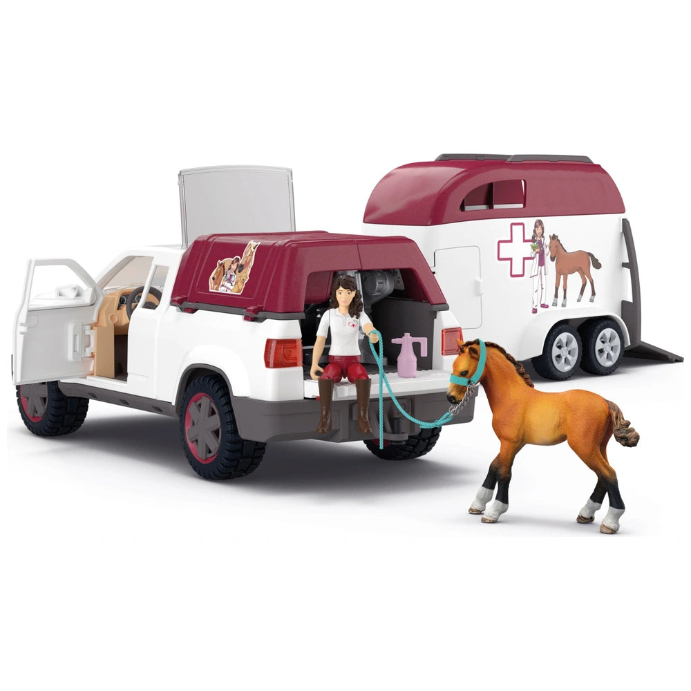 The schleich Horse Club 42704 Mobile Vet with Trailer is the perfect set for equestrian enthusiasts and budding veterinarians! Mrs. Kramer, the dedicated vet, is equipped with a new pickup truck and horse trailer to transport her patients to safety. When disaster strikes and the Tennessee Walker foal is injured, Mrs. Kramer is already on her way, ready to provide care!