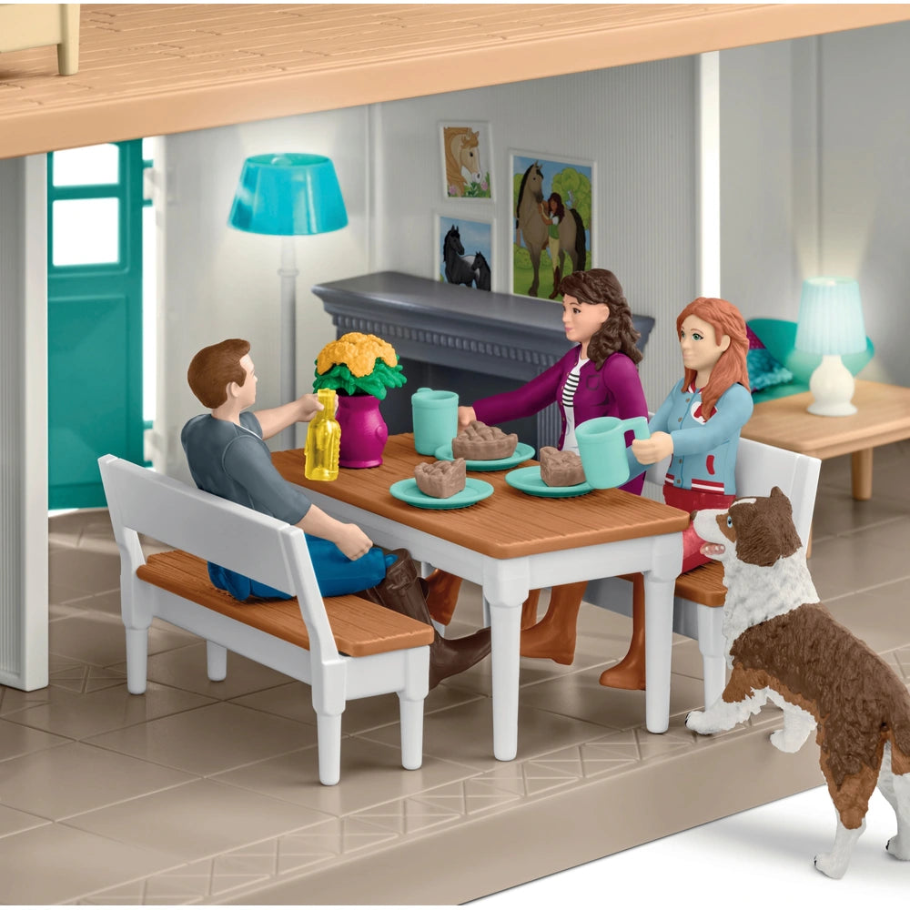 Inside the Kramer house, the delightful scent of Mrs. Kramer's freshly baked apple pie fills the air. The stable is fully equipped with saddles, bridles, and grooming supplies, while the house features a cosy, well-furnished interior with a charming balcony. This set inspires imaginative play, allowing children to engage in realistic horse care and fostering creativity.