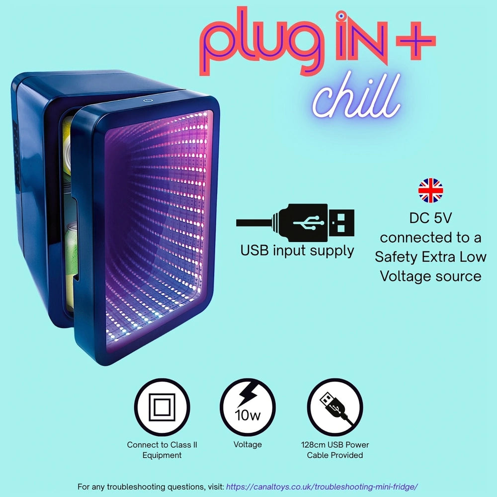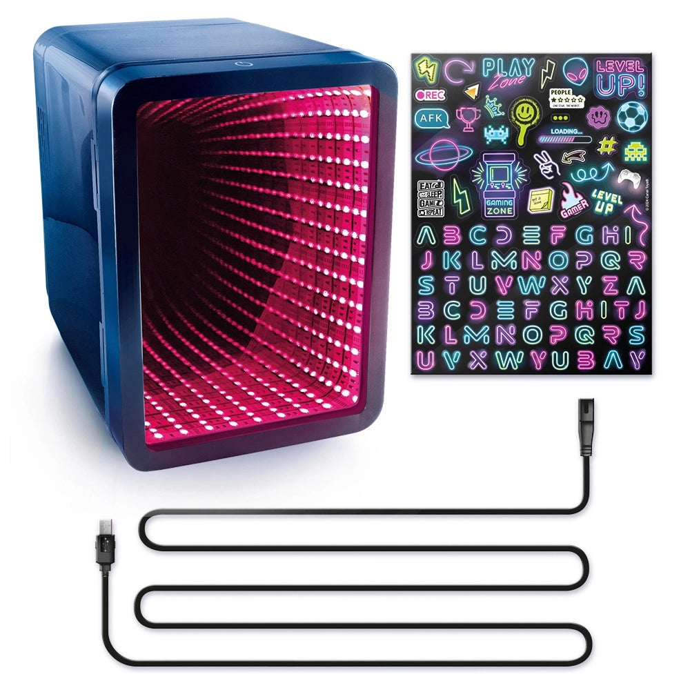 Upgrade your chill game with the So Chill Mini Fridge Infinity, the perfect accessory for gamers, tweens, and teens who love to keep things cool. This stylish mini fridge features an infinity light effect door that doubles as a sleek mirror, with 12 LED light modes to match your mood or style.