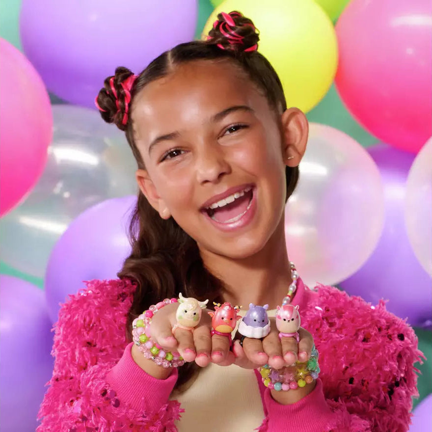 Squish on the go with Squish-a-longs! These portable collectibles are made of squeezable plastic and feature your favourite Squishmallows in their smallest size yet. With plenty of ways to Squish—in addition to 140+ Mini-Squish in Wave 4 alone—the Squish might be small, but the possibilities are endless. This Squish-a-longs 14-pack includes a Mini-Squish ring attachment for on-the-go Squish styling in addition to Heart Eyes Glasses, Flight Cap, Palette, and Seashell accessories for Mini-Squish modelling. Feeling lucky? You might just come across X. Axis the Pastel Rainbow Clown or Junie the Chocolate-Dipped Banana, two chase Mini-Squish that are as adorable as they are rare! Collect them all with help from the numbered Squish-a-longs Collector’s Guide and join the Squad today! Includes: (14) 1-inch Mini-Squish (4) Mini-Squish Accessories (1) Ring Attachment.