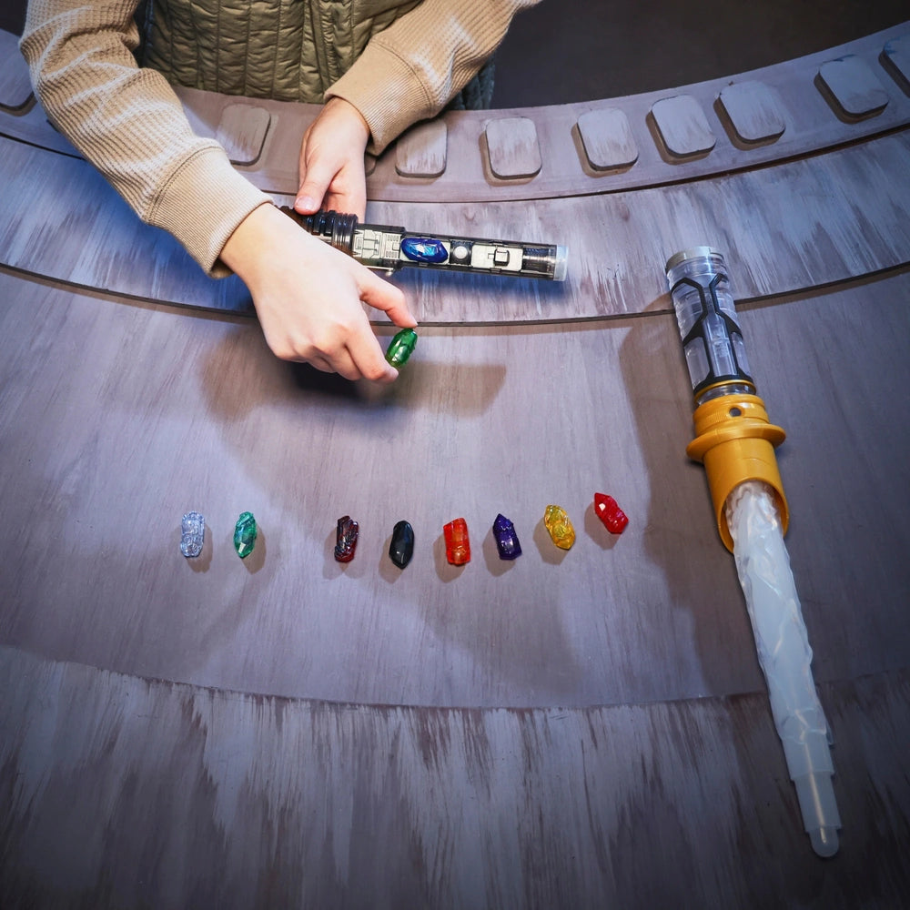 Contents: 1x lightsaber blade, 1x Force blast effect, 1x cap, 1x cover, 1x core, 10x crystals and 1x crystal guide