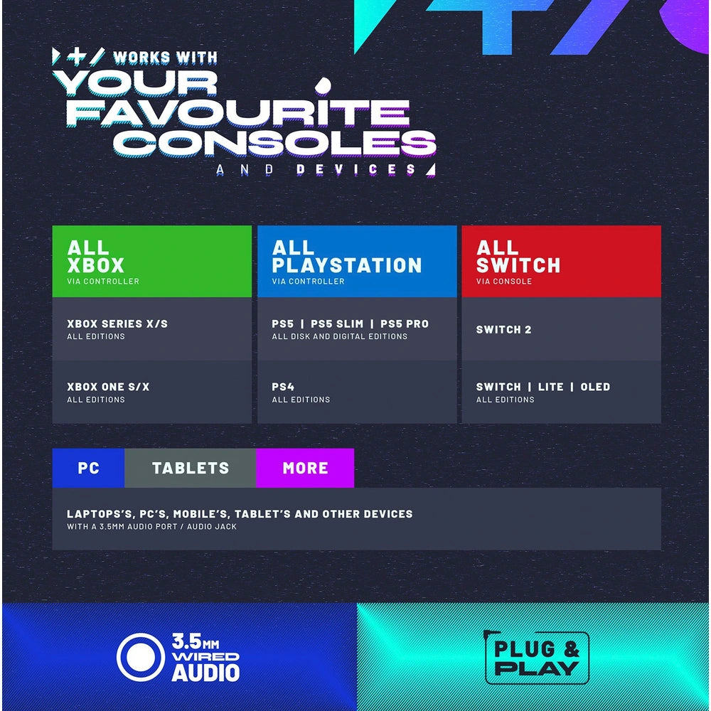 An LED light-Up multi-platform Gaming Headset. Compatible with PS4, PS5, Xbox One, Series S, Series X, Nintendo Switch, Nintendo Switch 2, PC and mobile devices.