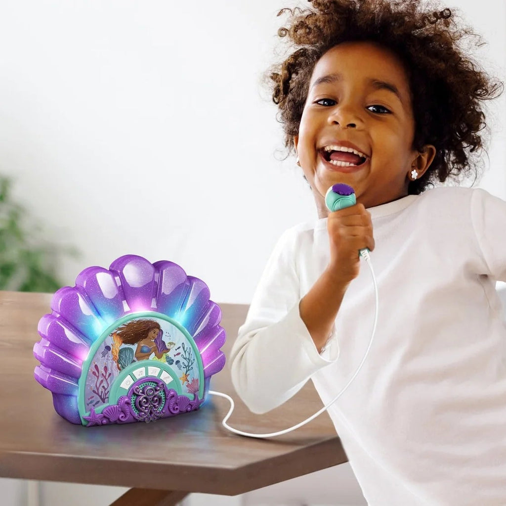 The Little Mermaid Use the real wired microphone to amplify your voice for all to hear while you perform ‘Part of Your World’ for friends and family. This karaoke boombox includes 2 versions of the popular song - with and without vocals. With cute graphics inspired by the new Disney film, this toy makes a great gift for any fan of The Little Mermaid!
