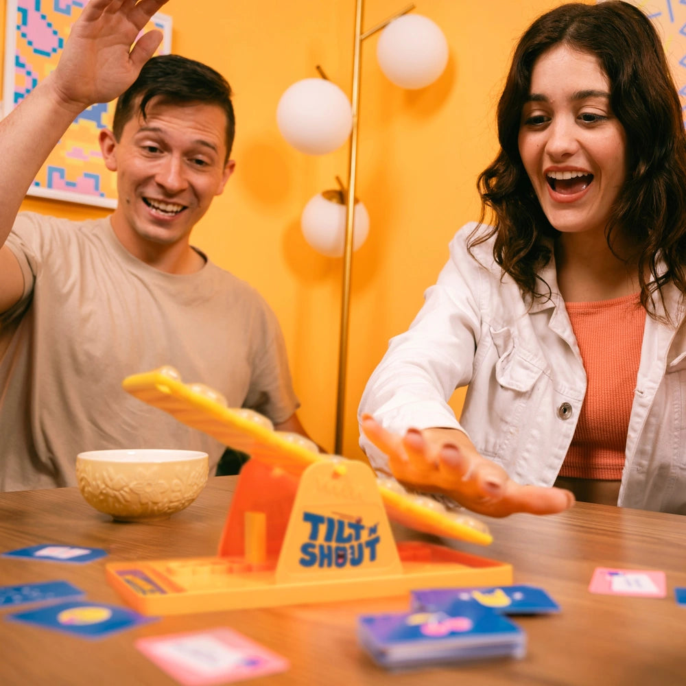 The Tilt 'n' Shout Game is a back and forth, shouty-outy experience for two teams. Both teams have to shout out answers to the same category in turn. If a team goes blank, and can't think of an answer in time, the other team captures the ball and wins the round. But watch out, this game comes with underdog comeback technology, so the better you do, the harder it is to win.