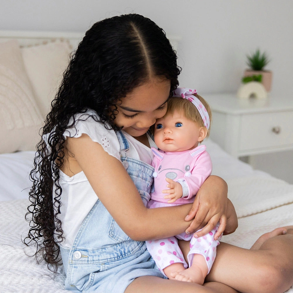 This adorable 44cm Tiny Treasures reborn baby doll, dressed in an adorable Pink Bunny Outfit, is so sweet and looks just like a real baby. She weighs 2lbs 10oz and comes with other gorgeous lifelike features including a realistic baby smell, super soft blonde hair which is perfect for brushing and gorgeous blue eyes that gently close as she drifts off to sleep. Tiny Treasures baby dolls are perfect for introducing little ones to care-taking behaviours, and also help them to develop social and emotional skills all whilst having so much fun playing. She comes dressed in a pink jersey top with an adorable, embroidered bunny face with 3D bunny ears and fluffy pom-pom cheeks, white leggings with a playful pink spot print and a matching spot print bow headband with a fluffy white pom-pom. She comes beautifully packaged in a car seat style box for even more play value and comes with a hospital wristband and birth certificate for you to fill in for even more pretend parenting role-play fun.