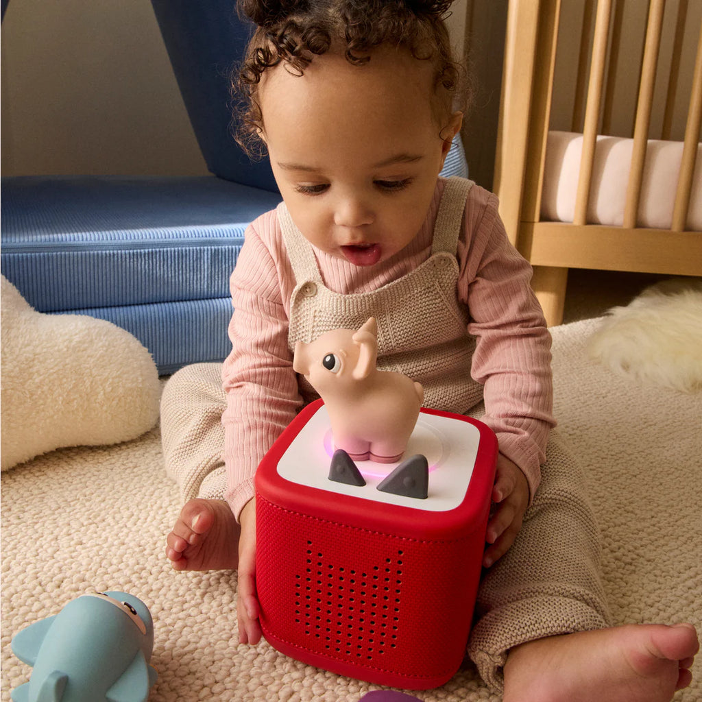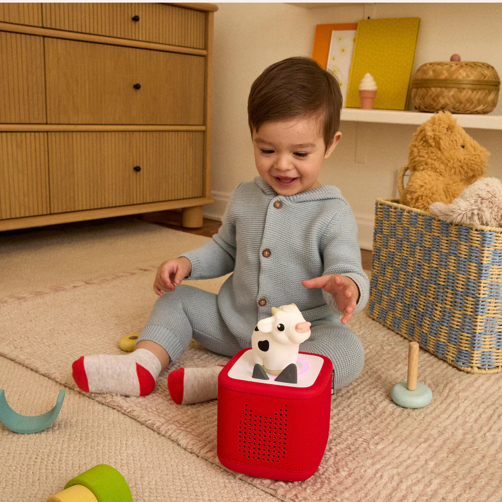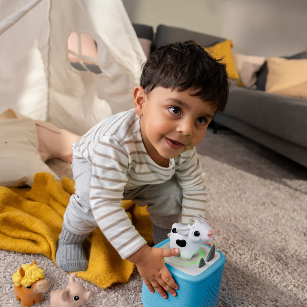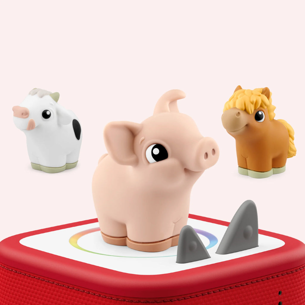 Squeeze, listen and learn with My first Tonies! Discover the wonderful world of farm animals! How do cows talk to their friends? What do pigs get up to all day? And how do horses like to play? Little listeners will love exploring their first farm animals in a fun and interactive way. With short, simple stories, catchy rhymes, real animal sounds, and lively music, young children (1+) can grow their vocabulary, strengthen their listening skills, and develop their language in a playful way. Each Tonie features a fun, original animal song to sing, and move along to. Rich soundscapes spark imagination and encourage open-ended play. Read and sung by both children and adults - enjoy the experience together. Perfect for curious little ears and hands! Cow "Moo!" says the cow. Join Mummy Cow and her calf in the pasture as they chat, munch on grass, and enjoy a peaceful stroll in the meadow. Listen closely - how does Mummy cow call to her baby? What noise does a calf make when it’s hungry? With a fun, original tonies song to sing and move along to! Read and sung by children and adults. Featuring real farmyard sounds! Pig Oink! goes the pig. Mama pig is looking for her piglets. Come on, let's help her and oink loudly. There they are! And we follow Mama Pig and the piglets into the sty. With an original tonies Pig song with catchy melodies to sing along and join in. Read and sung by children and adults. With real animal sounds! Horse “Giddy up!” goes the horse! Can you hear the horse? It's neighing. It's saying “Hello!” Come on, let's go to Mama Horse and her foal in the meadow. They're eating red apples that have fallen from the tree. And now they're playing tag and romping around. Soon, the foal gets tired and they look for a place to rest. With an original tonies Horse song with catchy melodies to sing along and join in. Read and sung by children and adults! With real Horse sounds! Neigh! says the horse. Can you hear that? The horse is neighing—it’s saying hello! Let’s join Mummy Horse and her baby foal as they snack on fallen apples, race around the meadow, and finally find a quiet spot to rest. Ahhhhhhhhhh. With a fun, original Tonies song to sing and move along to! Read and sung by children and adults. Featuring real animal sounds!