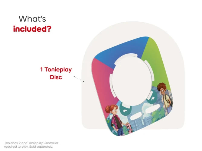 Zoe and her friend Sam are on a mission to rescue their neighbor's missing puppy, Poochie. In this interactive Tonieplay Game for ages 7+, kids explore the Big City, choose the route, uncover clues, and make real-time decisions to steer the adventure. Get ready for a story with 12 twists and turns and 4 alternate endings for hours of imaginative play time! Tonieplay unlocks new ways to play, only on Toniebox 2. Just pop the Tonieplay Disc and Controller on the Toniebox 2, and crack the case!