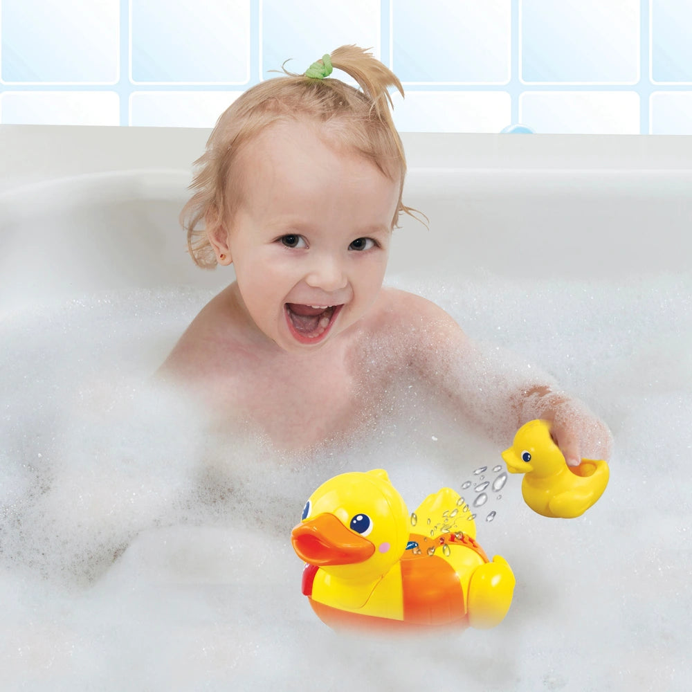 Introducing the VTech Float & Splash Duck Bath Toy! This cute and cheerful duck just loves to play in the bath, making bath time even more fun for your little one. Press Ducks light up button to trigger fun phrases, 3 sing-along songs and 15 melodies to liven up bath time. Use Duck's friend, Little Duck, to pour water. Pressing the light up button promotes hand/eye coordination and sing-along songs & fun phrases help encourage first words.