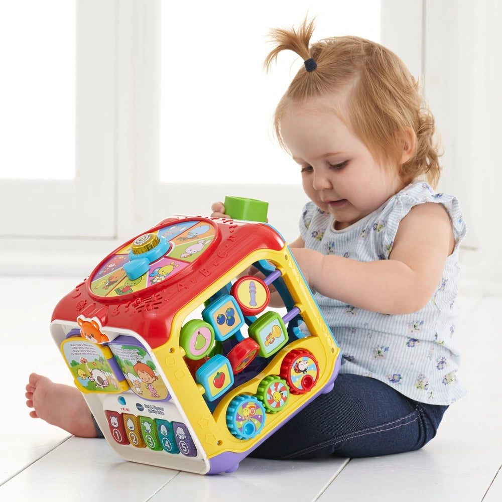 Turning book plays nursery rhymes, piano keys introduce colours, numbers and music. Spin the spinner to hear animal names and objects. Manipulative features include beads and gears for motor skill development, sliding monkey and butterfly encourage interaction and shape sorter develops hand- eye coordination. Includes 4 sing-along songs and 10 melodies.