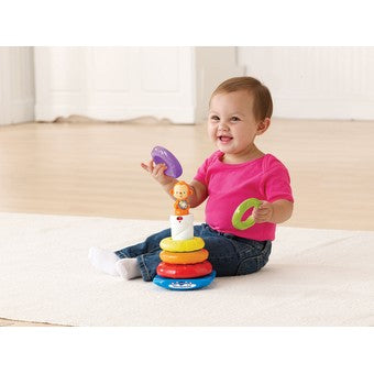 Stack and learn with Monkey using the 5 colourful textured rings. Place the rings on the wobbling base to discover fun sounds phrases and sing-along songs. Press the cute monkey to learn colours, numbers, shapes and to hear encouraging phrases. Stacking the rings helps develop gross motor skills.