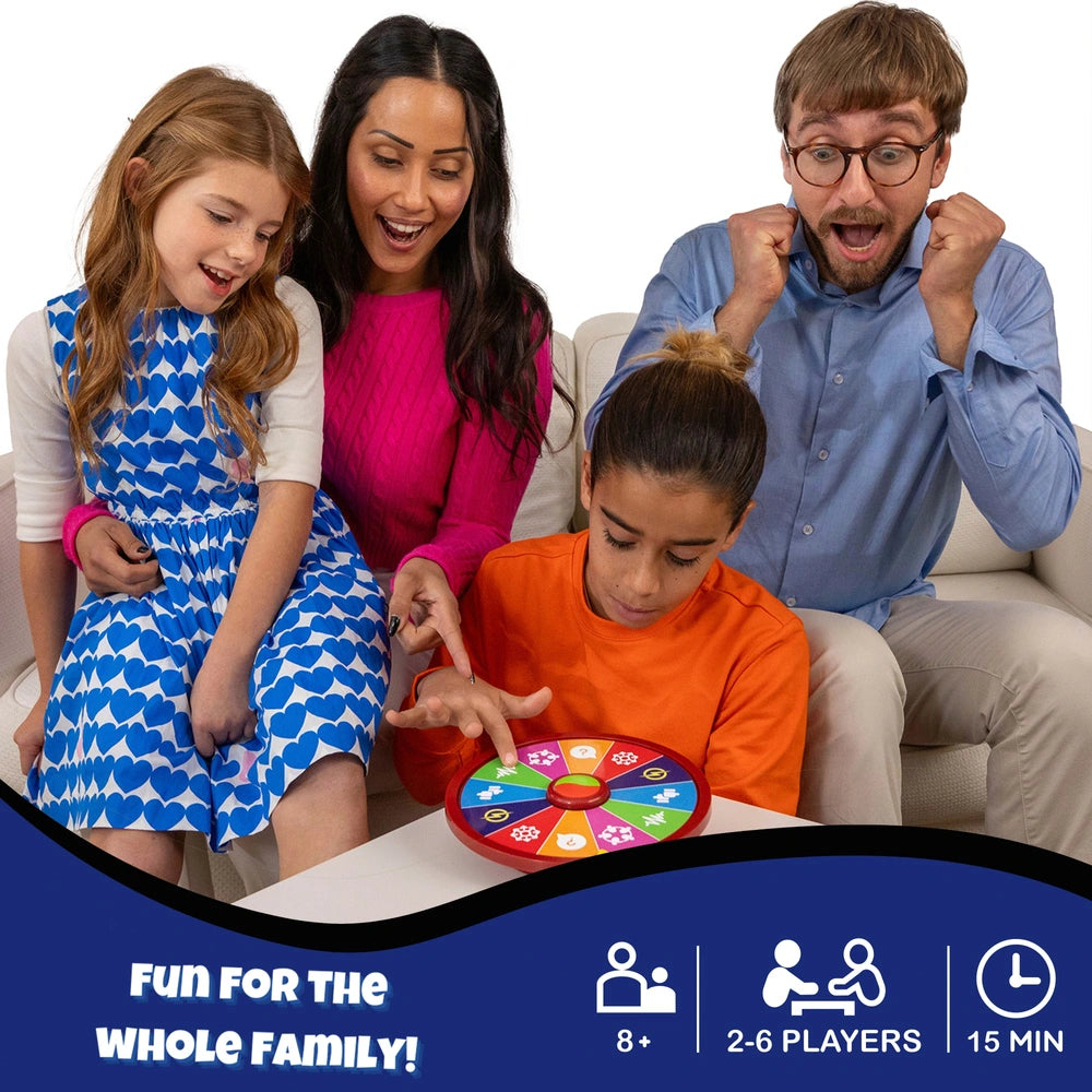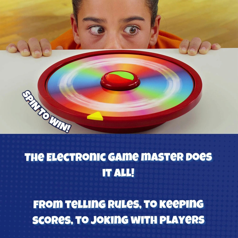 Wheel U Dare?' is the electronic family game show where you spin the wheel to uncover 300 challenges across 6 categories. Simply spin the wheel to hear it click just like it would on a gameshow, and score points by completing challenges. The person with the highest score wins! The electronic games master takes care of your whole game, they'll tell you the rules, explain the challenges, keep score, and even crack some one-liners so you don't have to. Compete in trivia including sound quizzes, questions about your family and friends, and guessing what the games master is hiding by solving his clues. You can even land on spaces for action challenges! Be careful though, you'll find challenges that score more points, some that lose points or even make you give points to your rivals. Did you land on the surprise space? The surprise could be good or bad!