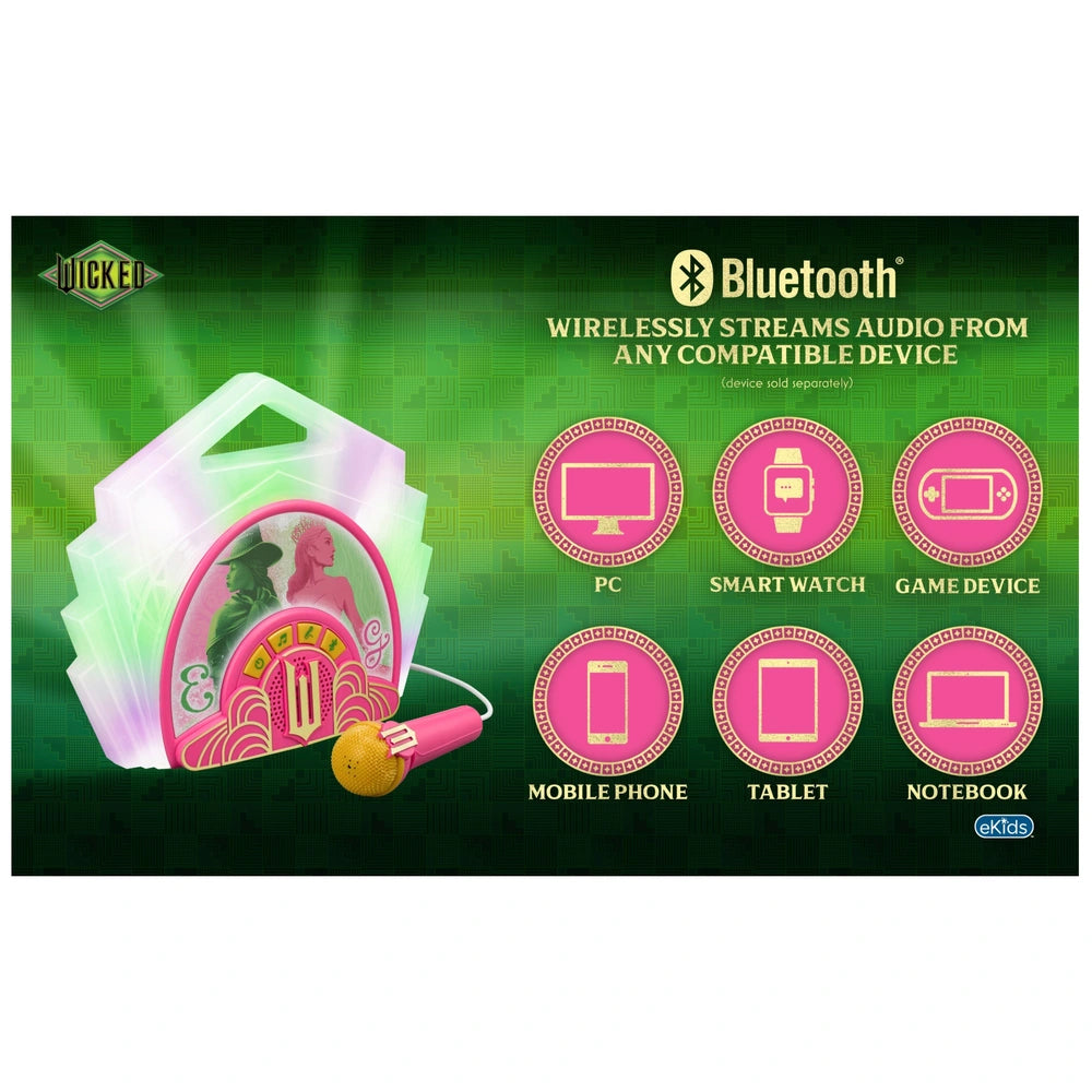 Step into the spotlight with the Wicked Sing-Along Bluetooth Boombox, perfect for fans of the iconic musical film! Designed for budding performers, this karaoke machine lets you sing along to your favorite tunes with ease. Connect your music device via Bluetooth to stream popular playlists or enjoy built-in clips of "Defying Gravity" and "Popular."