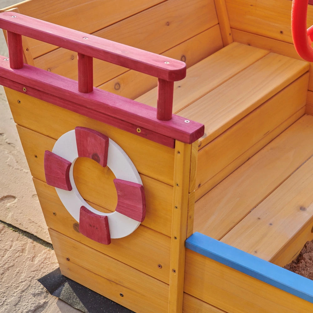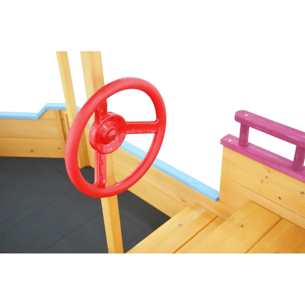 This colourful wooden pirate ship features sturdy wooden construction, with easy-to-step-over sides and secure handrails for little explorers. Add extra imagination to sandbox playtime with a comfortable, sturdy wooden bench and a steering wheel to create your own captains seat!